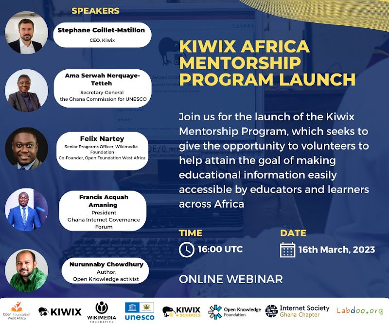 Take advantage of this opportunity to be a part of the launch of the Kiwix4Schools Africa Mentorship Program. Register now using the link provided (https://bit.ly/41z3dKY) and join us on the 16th of March 2023 at 16:00 UTC. Let’s work together to improve access to education in Africa.